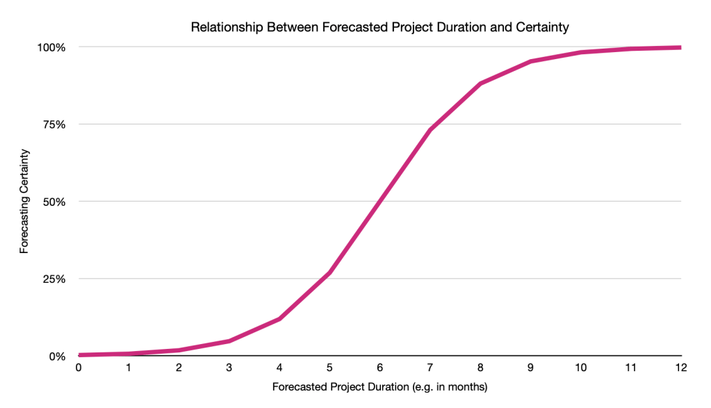 The above curve will be different for each project due to project-specific factors, but the general shape will look similar. The first few units of time (for example, days, months, years), the likelihood of completing the project will be near 0%. After some time passes, the chances the project will complete accelerates. The speed of which it accelerates is highly dependent on the number and intensity of risks that can derail the project schedule. Eventually, certainty reaches a point of diminishing returns because no one can ever be absolutely 100% certain about how long a project will take (and the sigmoid curve will accordingly never actually hit 100%).