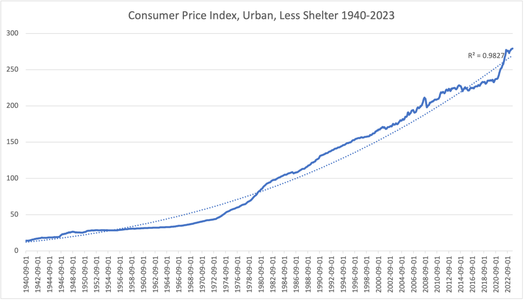 However, the Consumer Price Index (a sample measure of goods and services which measures the cost of living), excluding shelter, below, is currently on-par with long-term trends (albeit currently 1.8% over, which is insignificant compared to historical data), despite the velocity of its inflationary run since 2020. The inflationary environment we see ourselves in right now is more of a return to the baseline after goods were roughly 4% under long-term trends.